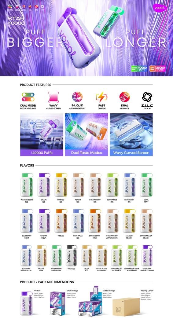 The Vozol Star 40K Puffs 5% Nicotine Vape is a high-performance disposable vape designed for lasting enjoyment and premium flavor. With up to 40,000 puffs, 5% nicotine strength, and a sleek modern design, it delivers smooth, rich vapor in every draw. Featuring a rechargeable battery, smart LED display, and leak-proof technology, this device combines convenience, power, and style for the ultimate vaping experience