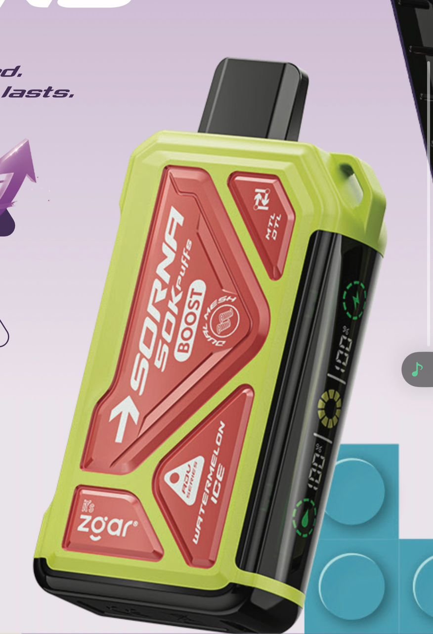 The ZGAR SORNA 50K Disposable Vape delivers up to 50,000 puffs with smooth flavor and consistent vapor. It features 2% nicotine salt, a rechargeable battery, dual mesh coil technology, and adjustable airflow for a customizable and long-lasting vaping experience in a sleek, portable design.