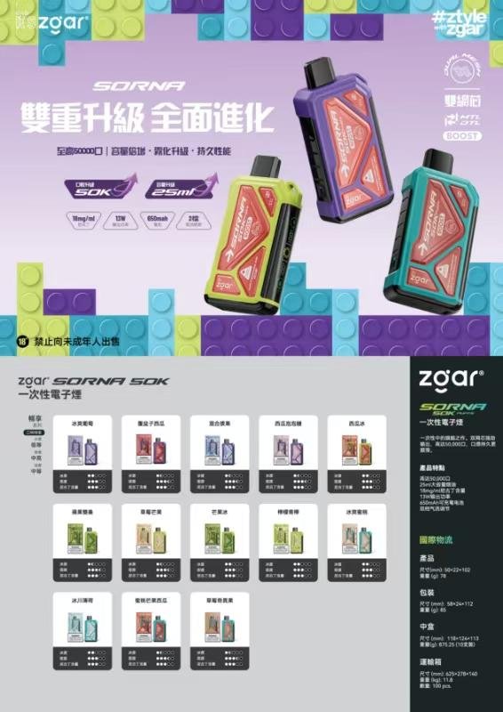 The ZGAR SORNA 50K Disposable Vape is a high-capacity vaping device designed for extended performance and smooth flavor delivery. It offers up to 50,000 puffs and comes with 2% nicotine salt, providing a balanced and satisfying vaping experience.